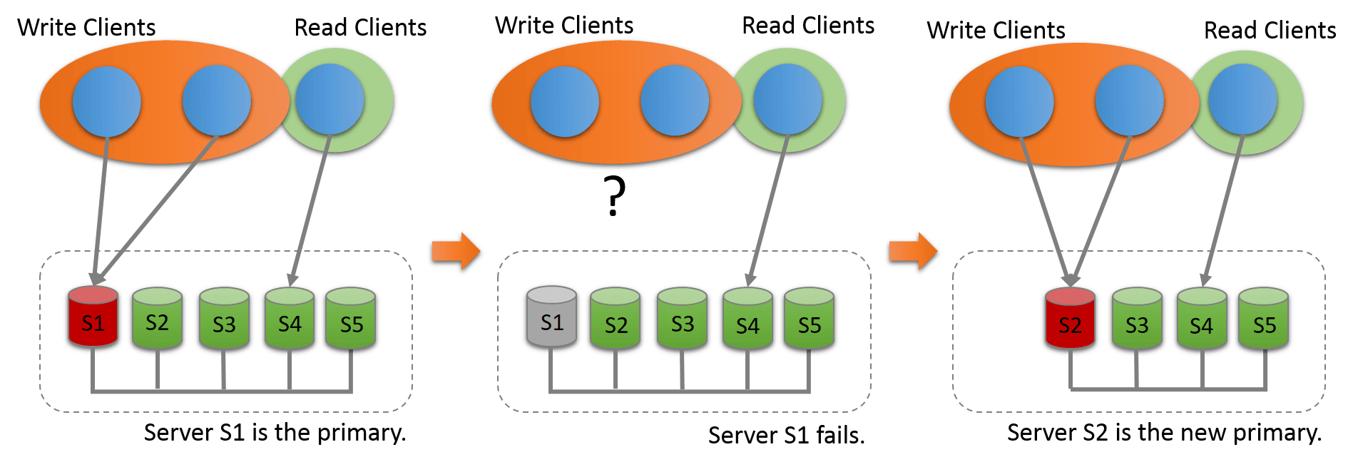 UDF は、すべてのグループメンバーが MySQL 8.0.13 以上を実行している場合にのみ使用できます。 新しいプライマリサーバーが自動的に選択されるか、手動で指定されると、自動的に読取り /書込みに設定され、他のグループメンバーはセカンダリとして残り、読取り専用のままになります。図18.4「新規プライマリ選択」 にこのプロセスが表示されます。