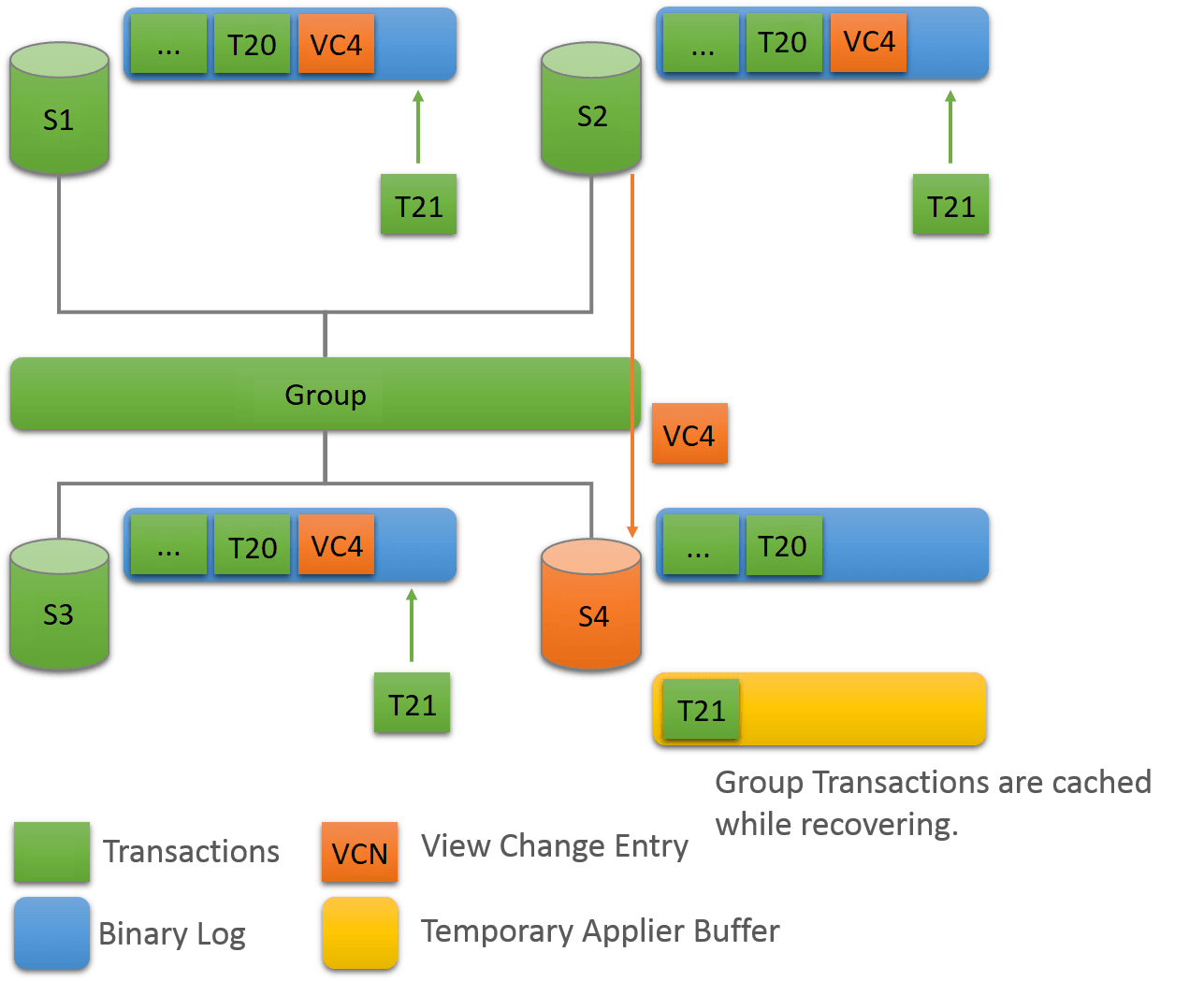 一方、参加メンバーは、ビュー抽象化を介してメンバーシップサービスによって記述されているように、オンラインサーバーのリストから適切なドナーを選択します。 メンバーがビュー 4 に参加し、オンラインメンバーがビュー変更イベントをバイナリログに書き込みます。