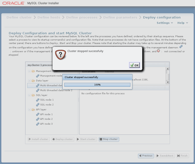 : 構成が有効かどうか検証します。 クラスタホスト上に必要なディレクトリを作成し、各ホストに構成ファイルを配布します。 進捗バーには、次に示すようにデプロイメントの進行状況が表示され、次に示すように、デプロイメントが完了するとダイアログが表示されます: