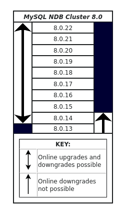ここに示すテーブルは、NDB 8.0 の異なるリリース間での NDB Cluster のアップグレードおよびダウングレードの互換性に関する情報を示しています。 NDB Cluster 8.0 リリースシリーズへのアップグレード、NDB Cluster 8.0 リリースシリーズからのダウングレード、または NDB Cluster 8.0 リリースシリーズ内でのダウングレードに関する追加のノートは、次のテーブルのあとにあります。