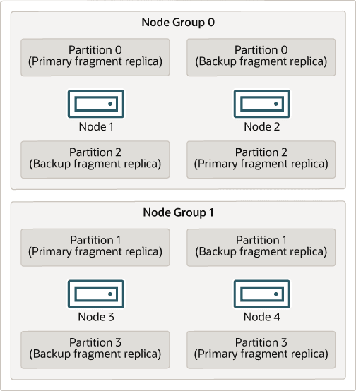 The data stored by the cluster is divided into four partitions, numbered 0, 1, 2, and 3. Each partition is stored—in multiple copies—on the same node group. Partitions are stored on alternate node groups as follows: