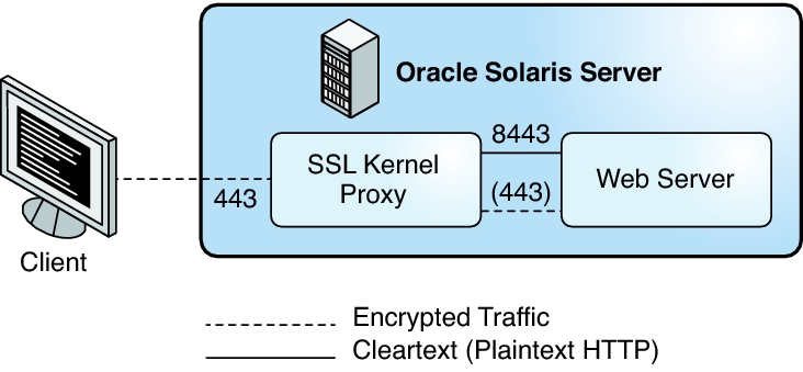 Figure 3–1 shows a basic scenario with a web server that is using the SSL kernel proxy. The SSL kernel proxy is configured on port 443, whereas the web server is configured on port 8443, where it receives unencrypted HTTP communications.