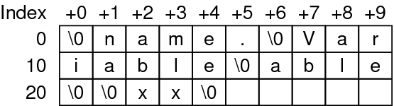 The first byte, which is index zero, holds a null character. Likewise, a string table's last byte holds a null character, ensuring null termination for all strings. A string whose index is zero specifies either no name or a null name, depending on the context.