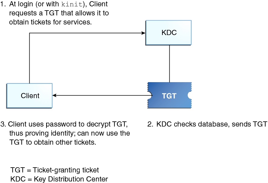 A client (a user, or a service such as NFS) begins a Kerberos session by requesting a ticket-granting ticket (TGT) from the Key Distribution Center (KDC). This request is often done automatically at login.