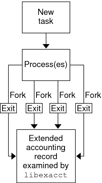 For example, with extended accounting enabled, the task tracks the aggregate resource usage of its member processes. A task accounting record is written at task completion. Interim records on running processes and tasks can also be written. For more information on tasks, see About Projects and Tasks.