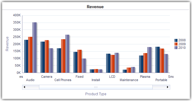 Por ejemplo, mientras se visualiza un gráfico en los resultados de un análisis Brand Revenue, puede acercar el eje Tipo de producto. De esta forma, puede desplazarse por el eje y ver más datos por tipo de producto.
