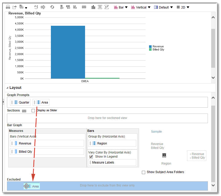 Puede colocar una columna en dicho destino después de haber creado las vistas para el análisis de distintas formas. Por ejemplo, puede seleccionar Excluir columna del menú contextual de una vista. Suponga que está editando una vista en su editor y que agrega una columna a esa vista desde el panel Áreas temáticas. Las columnas se colocan en el destino de arrastre Excluido para todas las demás vistas del análisis.