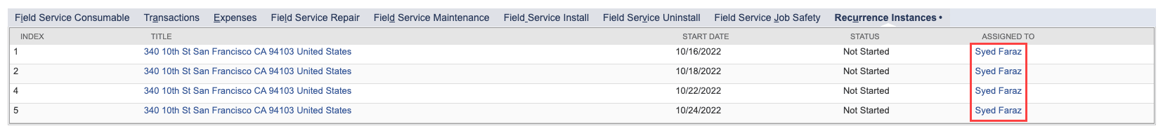 The system auto-generates more records based on the selected recurrence parameters. This can take a little time. When you refresh, you'll see the generated records under the Recurrence Instances subtab under the Field Service subtab.