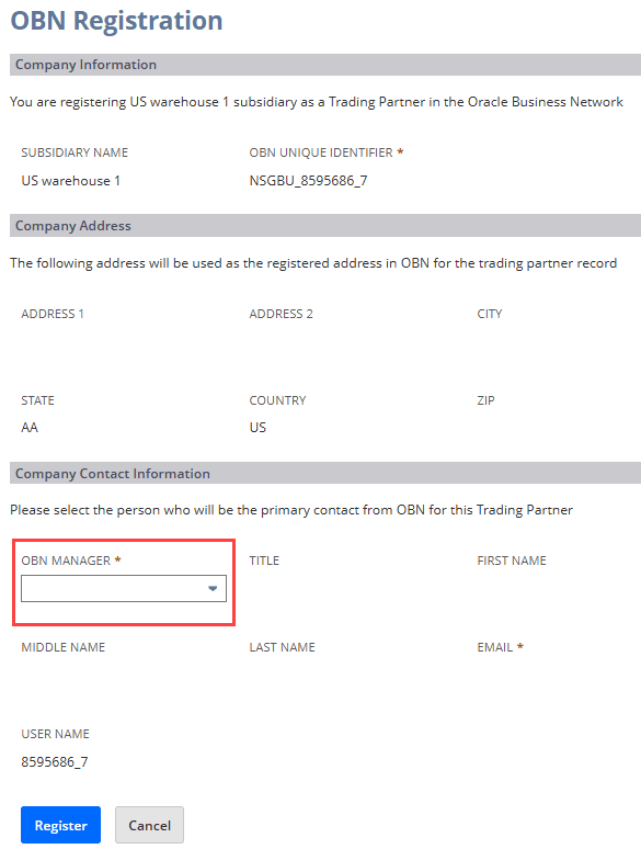 On the OBN Registration page, from the OBN Manager list, select the name of the person as primary contact for the trading partner.