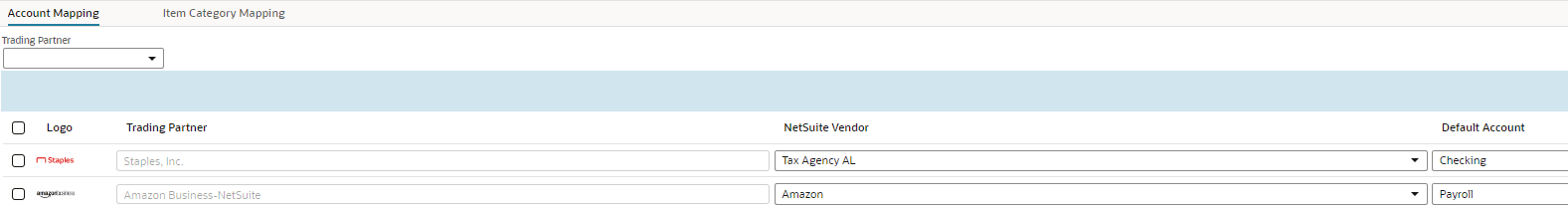 The following image illustrates an example for trading partner and vendor mapping on the Account Mapping subtab.
