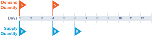 The supply order scheduled for day 6 is not needed on that day, based on demand. NetSuite suggests delaying this order, moving it out from day 6 to day 8, when there is demand for the item.