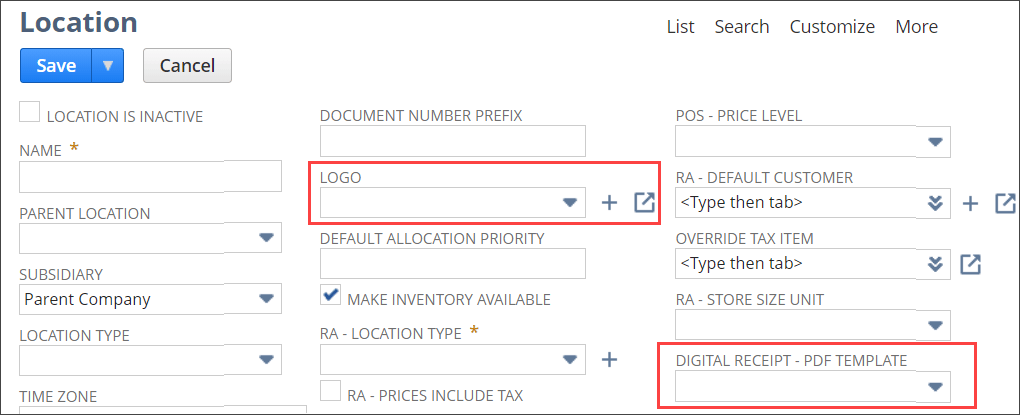 In addition to setting up a default digital receipt, you can set up unique receipts to use at specific locations. For example, you might want to use a different logo or display company information that is different from the default.