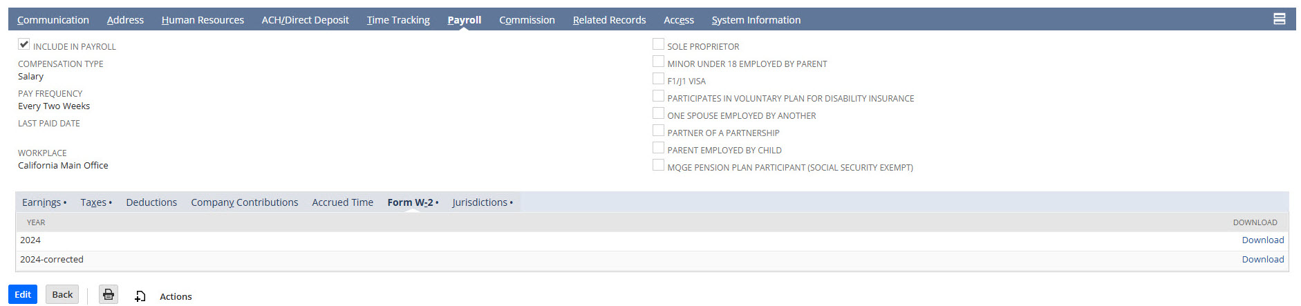 You can view an employee's Form W-2 and Form W-2 C from the Form W-2 subtab under the Payroll tab of the Employee record. If you have to download Form W-2 for multiple employees, you need to access the Employee record for each employee separately.
