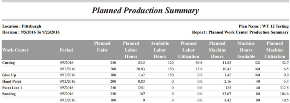 Work Center Utilization by Period – Review available work center hours against recorded work center use. The system reports utilization measurements for both labor and machines by work center.