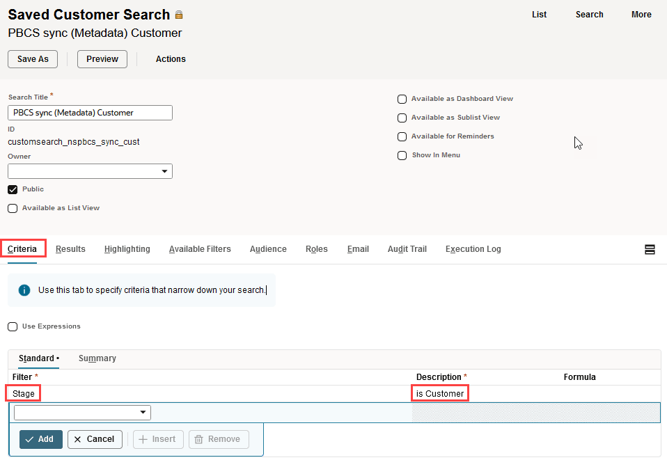 If you disable the CRM feature, the Stage filter is no longer available to ensure that only customers are returned. For information about how to enable the CRM feature, see Required Features for Installing the NSPB Sync SuiteApp. For general instructions on how to customize a saved search, refer to Customizing NSPB Sync Saved Searches.