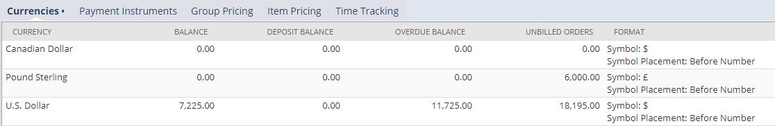 In customer records, the Financial subtab includes balances for all currencies. Balances in each currency appear in the Currencies subtab, as shown in the following screenshot. If you use the Consolidated Payments feature, consolidated balance information is shown in each currency.
