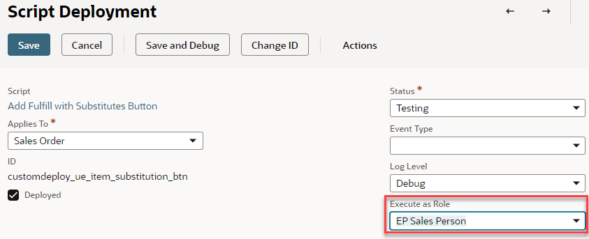 NetSuite lets you switch the deployment status to Testing when you are setting the script to execute as a different role. When you do this, the script will be triggered only by you. And, when it executes, it will execute as the role you selected.