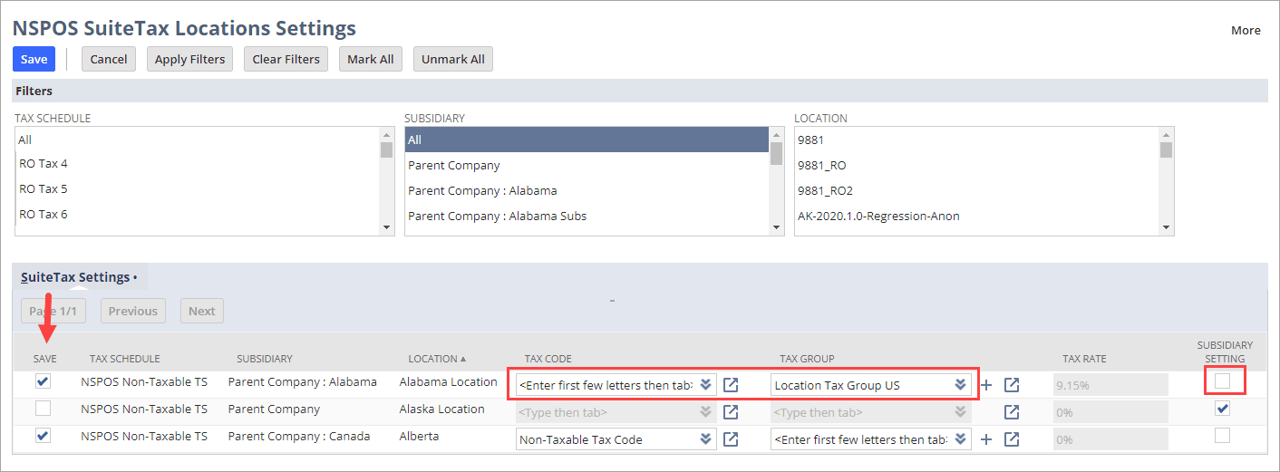 If a location does not have a specific tax configuration, SuiteTax uses the values configured for the location's subsidiary. If no subsidiary configuration exists, SuiteTax uses the tax schedule configuration.