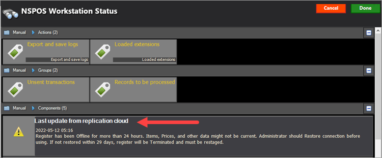 Terminated - Register is either offline and has not connected to the replication cloud for more than 30 days, or it was manually inactivated on the RA-Workstation record. Communication with the replication cloud isn't possible. Bringing the register back online requires restaging.