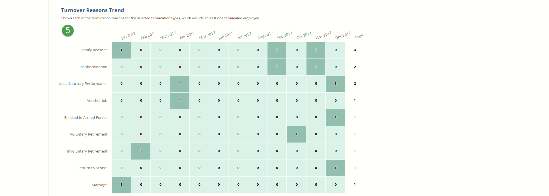 The Turnover Reasons Trend breaks down all termination reasons for each selected type with at least one terminated employee. The data is shown by month for the selected year and segments, with the highest turnover reason at the top. |