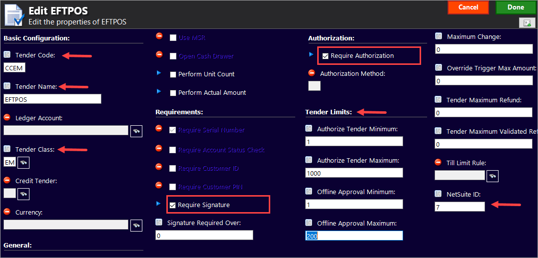 NetSuite ID – To integrate the tender with NetSuite ERP, enter the Internal ID from the payment method to be used with this tender.