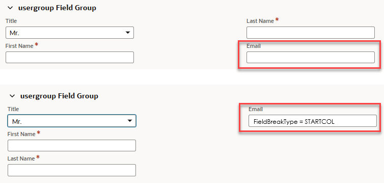 Use the STARTCOL value to move a field to a new column. The following screenshot shows the difference between the EMAIL field when the break type is set to NONE (top image) and when it is set to STARTCOL (bottom image).
