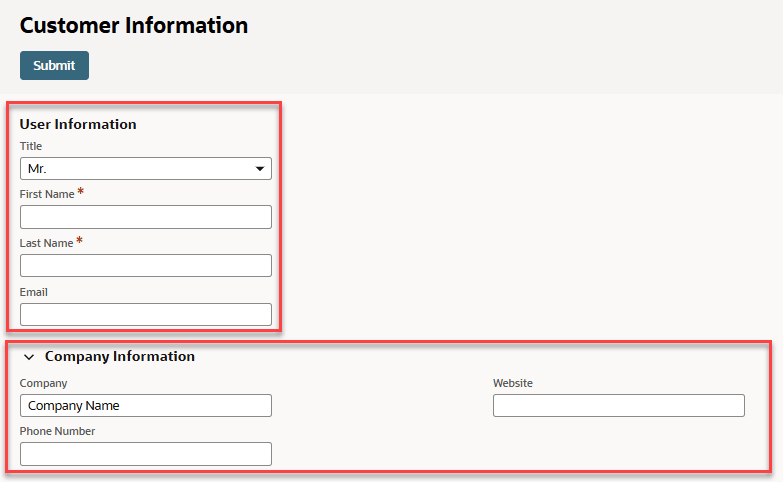 Use field groups to organize and manage fields on a form. Some of the properties listed in serverWidget.FieldGroup can provide additional field group customization.