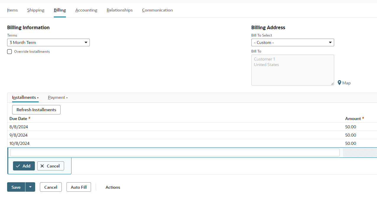 After saving the installment term, you can add it to a sales order. On a sales order, you can only view installment details, and can't be edited. Any editing should be done on the invoice.