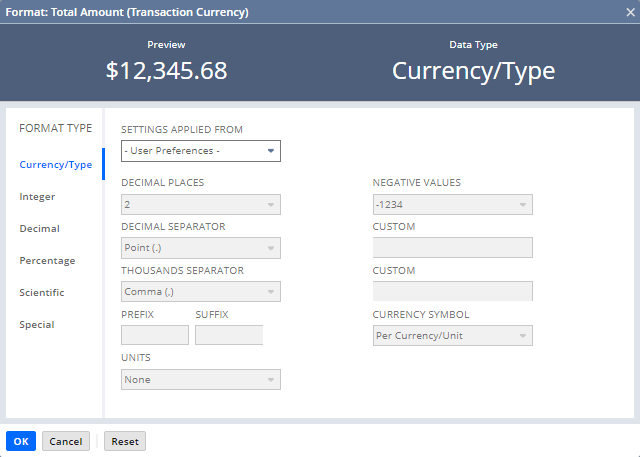 Settings Applied From: Lets you set numeric formatting based on a specific language. To set every setting manually, select Custom. To use the formatting from your NetSuite personal preferences, select User Preferences. For more information about personal preferences, see Setting Personal Preferences.