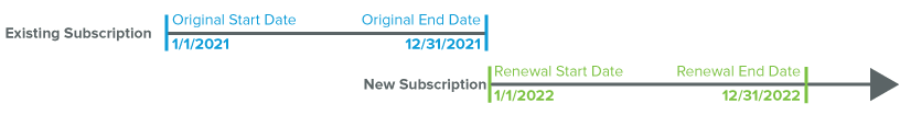 When you choose the Create New Subscription renewal method, the start date on the new subscription is the original subscription's renewal date.