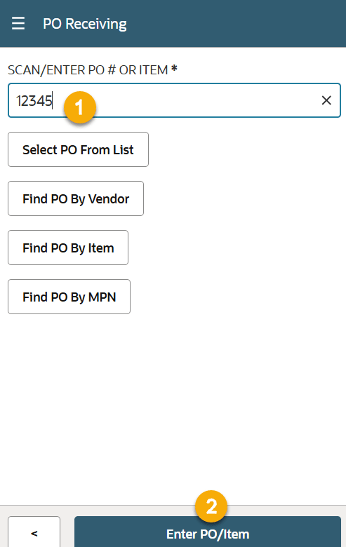 As shown in the following image, to process purchase order #12345, enter 12345 in the Scan/Enter PO # or Item field. Then, tap Enter PO/Item.
