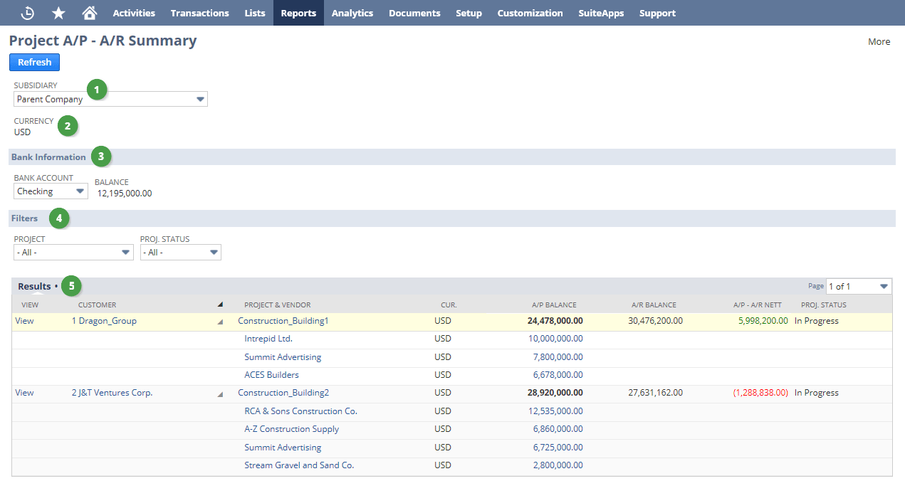 You can view a summary project-related payable and receivable transactions per subsidiary from the Project A/P – A/R Summary page. From this page, you can also navigate to the Bill Payment page where you can pay bills associated with a vendor.