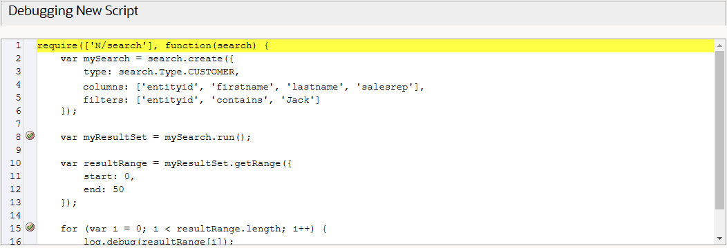 /** * @NApiVersion 2.x */ require (['N/search'], function (search) { var mySearch = search.create({ type: search.Type.CUSTOMER, columns: ['entityid', 'firstname', 'lastname', 'salesrep'], filters: ['entityid', 'contains', 'Jack'] }); var myResultSet = mySearch.run(); var resultRange = myResultSet.getRange({ start: 0, end: 50 }); for (var i = 0; i < resultRange.length; i++) { log.debug(resultRange[i]); } }); -
