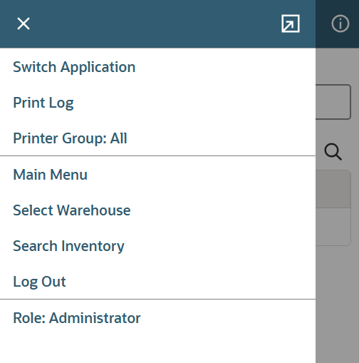 The rest of the Options menu links depend on the associated mobile app. For example, the Ship Central app includes links for Generate Manifest, Schedule Pickups, and Void Shipping Label, among others. The WMS app includes the Search Inventory link. Aside from the links, you can tap the following icons located at the header of the options menu: