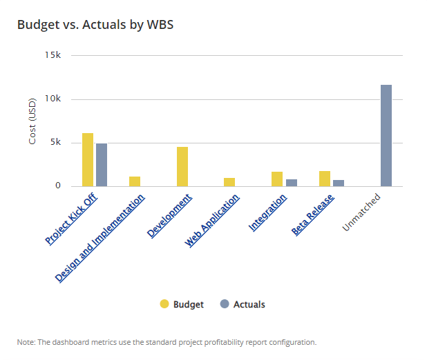 The Budget vs. Actuals by WBS in Project 360 Dashboard shows a visual comparison of the estimated costs of the project to the expenditures of completing the project.