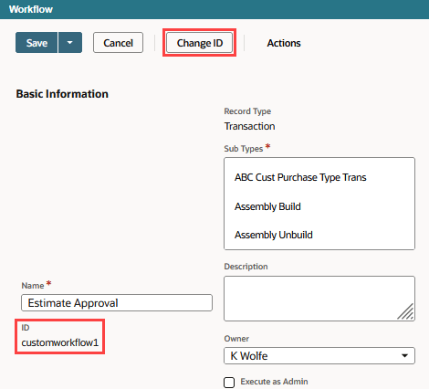 After you create a workflow, you can edit its script ID on the workflow definition page. You can edit the ID to change the script ID that you set when you created the workflow, or override the one that NetSuite generated automatically.
