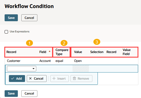 Use the Condition Builder to define a condition using record field value comparisons. You can access the Condition Builder from the Condition field in the workflow, action, or transition definition.