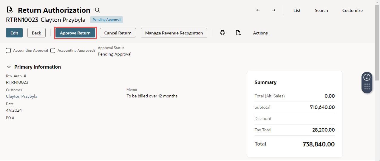 You can also approve return authorizations by going to Transactions > Customers > Issue Return Authorizations > Lists (Administrator) to open the authorization and click Approve Return.