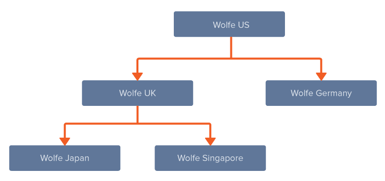 In the sample hierarchy below, you are rolling up the balances from Wolfe UK into the Wolfe US consolidated parent. The appropriate consolidated exchange rate for each account is used to roll up the balances into U.S. dollars.