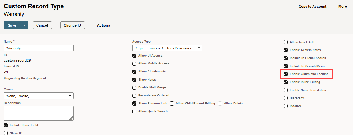 The Enable Optimistic Locking option is enabled by default for all custom record types created as of 2012.2 and later. For backward compatibility, this option is disabled by default for custom record types created prior to 2012.2. You should enable this option, but first review any scripts that may be affected by this change and edit them as needed.