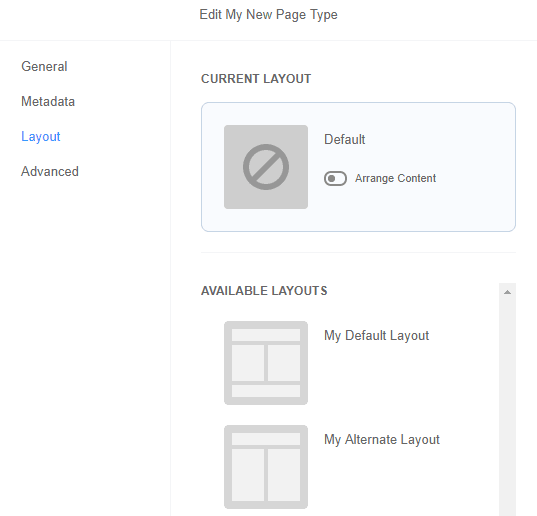 In this example code snippet, SMT provides my-new-alternate-template.tpl as an optional layout when an SMT admin creates or edits a page with MyNewPageType or cms-landing-page as the page type. This layout displays alternate-thumbnail.png as the thumbnail image with the label: My Alternate Layout. In SMT, you see the default layout and thumbnail for the page type as shown in the example below.