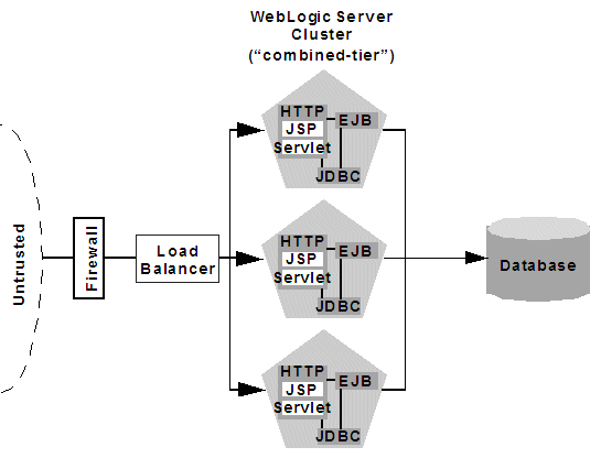 When using a third-party load balancer with in-memory session replication, you must ensure that the load balancer maintains a client's connection to the WebLogic Server instance that hosts its primary session state (the point-of-contact server). For more information about load balancers, see Load Balancing HTTP Sessions with an External Load Balancer.While a combined tier architecture, such as the Recommended Basic Architecture, meets the needs of many Web applications, it limits your ability to fully employ the load balancing and failover capabilities of a cluster. Load balancing and failover can be introduced only at the interfaces between Web application tiers, so, when tiers are deployed to a single cluster, you can only load balance between clients and the cluster.