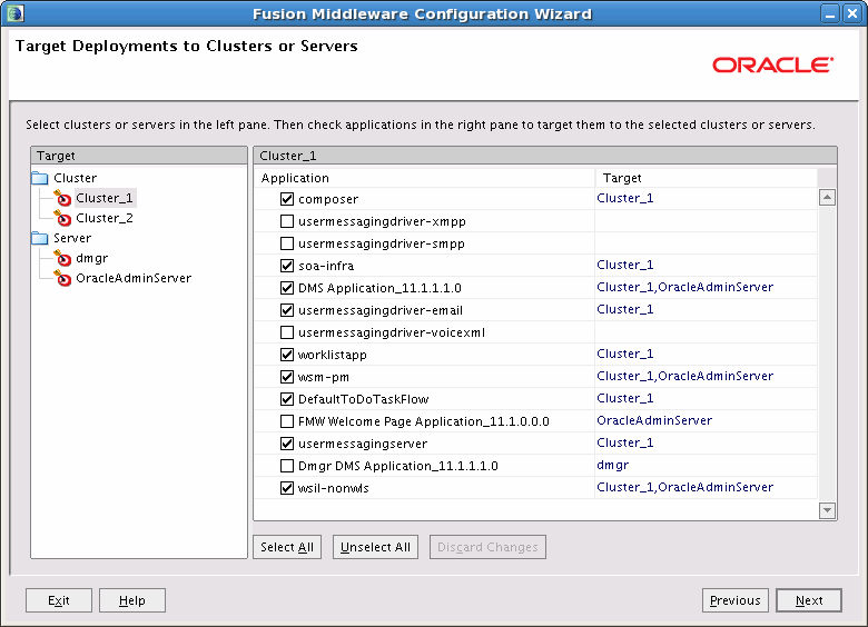 Applications associated with the product for which you are configuring the cell (for example, Oracle SOA Suite) are targeted automatically to the server that was created for that product or to the cluster to which that server is assigned. In this screen, you can target applications to additional servers and clusters.
