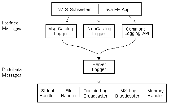 There are two basic components in any logging system: a component that produces log messages and another component to distribute (publish) messages. WebLogic Server subsystems use a message catalog feature to produce messages and the Java Logging APIs to distribute them, by default. Developers can also use message catalogs for applications they develop.