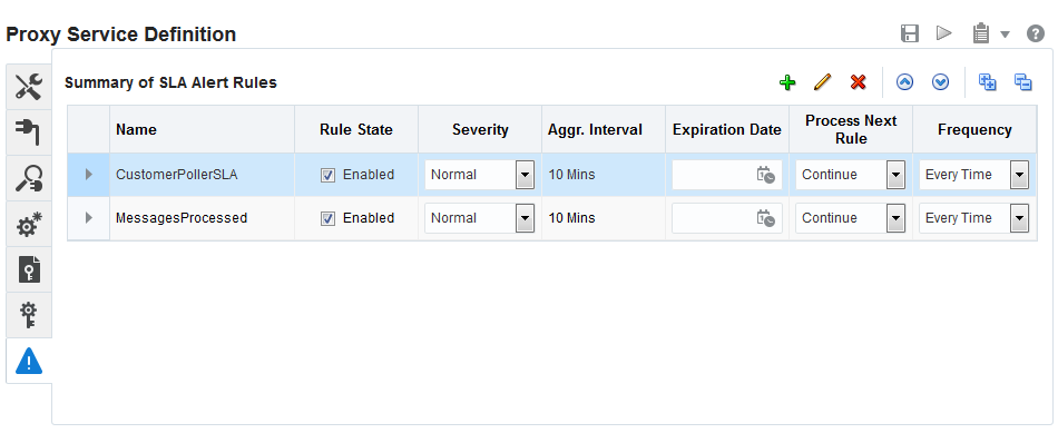 For example, to enable SLA alerts for a proxy service, you must define the alert rules for that service in Oracle Service Bus Console, enable SLA alerting and monitoring for that proxy service, and enable SLA alerting and monitoring globally for the service bus domain. The last two steps are performed in Fusion Middleware Control. The same steps apply to enabling pipeline alerts.
