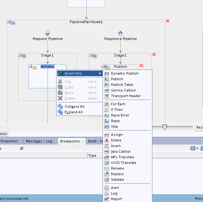 Right-click the template placeholder icon to get options for message flow components that you can add. Click Insert Into from the context menu that appears.